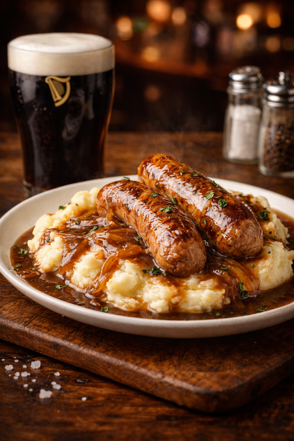 Wagyu sausages with creamy mash, peas and onion gravy, paired with a middy of Guinness.