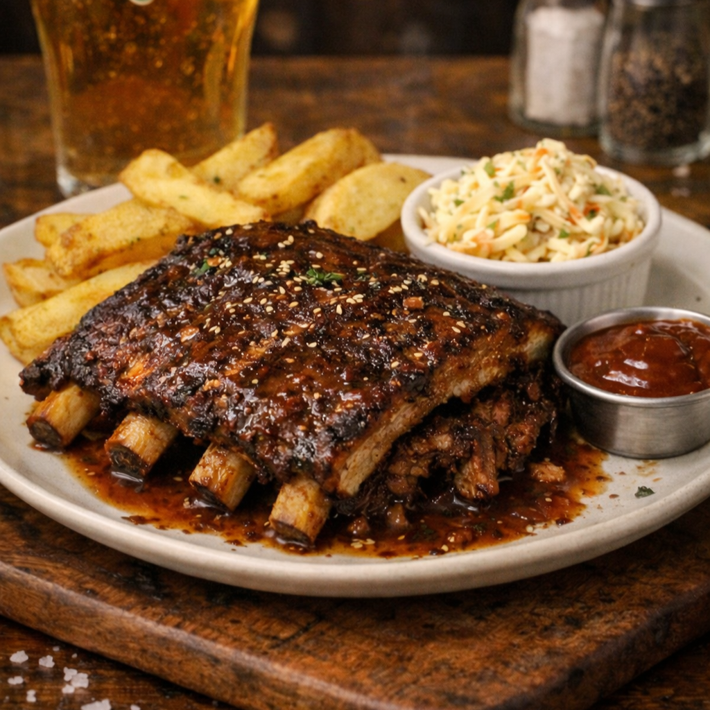 Slow-cooked pork ribs with creamy slaw, pickles, onion rings & fries paired with a middy of Little Creatures.