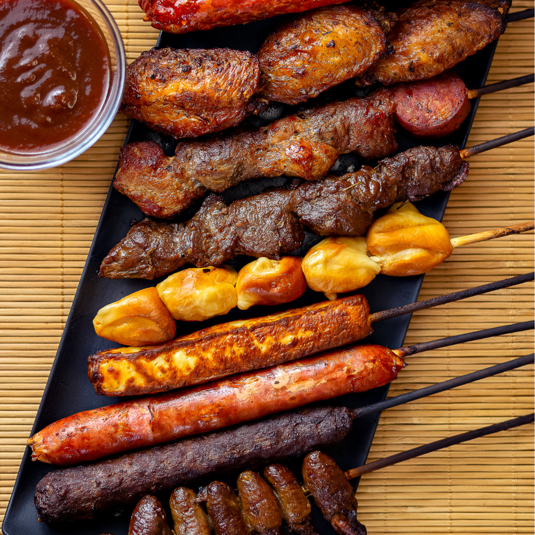 Aussie BBQ Share Platter: A generous selection of pork snags, lamb cutlets, chicken skewers, lamb kofta, and beef skirt steak, perfect for sharing with mates.